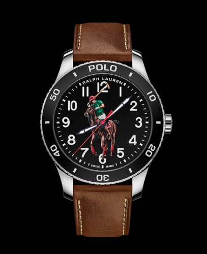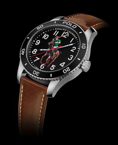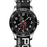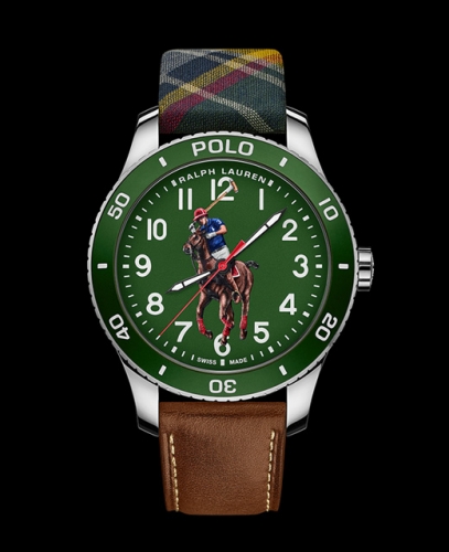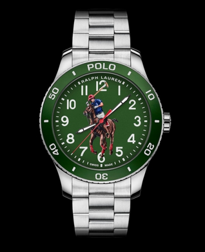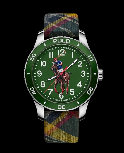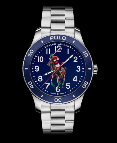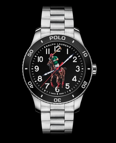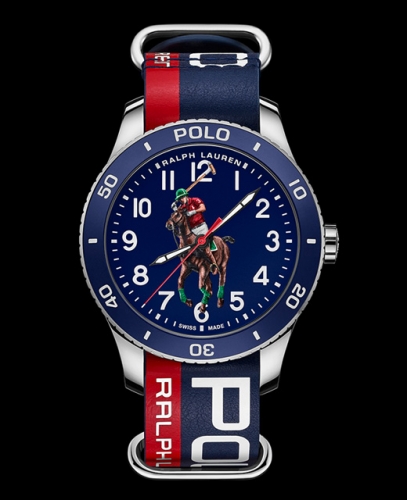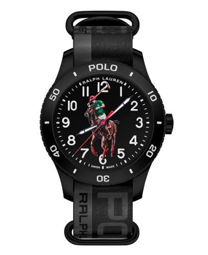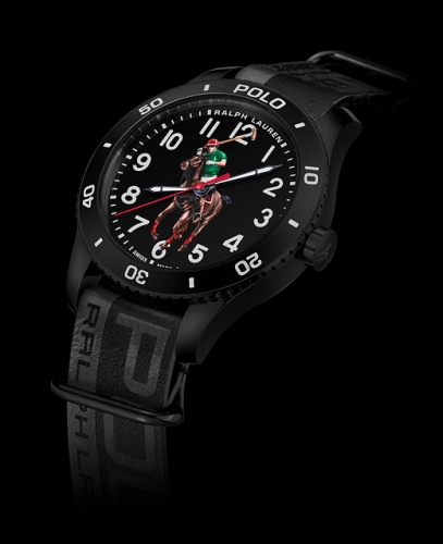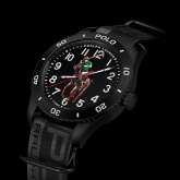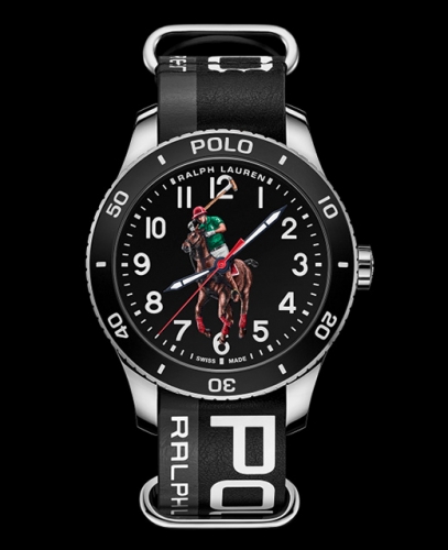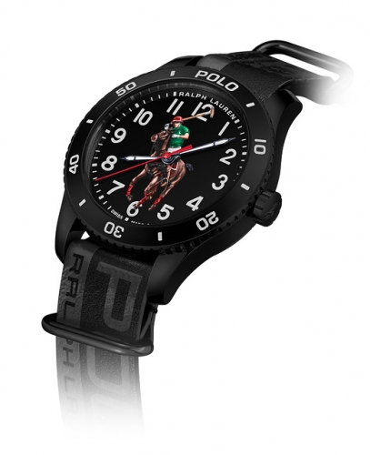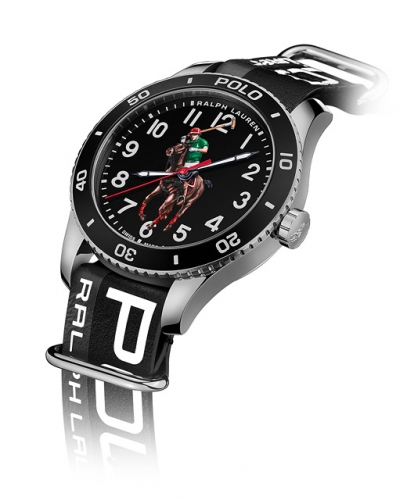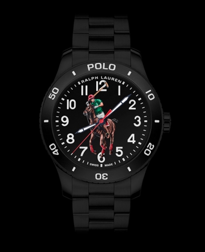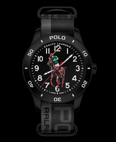 In 1972, Ralph Lauren's signature emblem—capturing the penultimate moment before mallet meets ball during a polo game—took its place on the chest of the Polo shirt, where it became a symbol recognized around the world. Now gracing the dial of this new watch collection, the logo is 3-D printed in multiple layers of color and complemented by printed Luminescent Arabic numbers on a lacquered dial and around the anodized aluminum ring on stainless steel bezel.