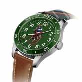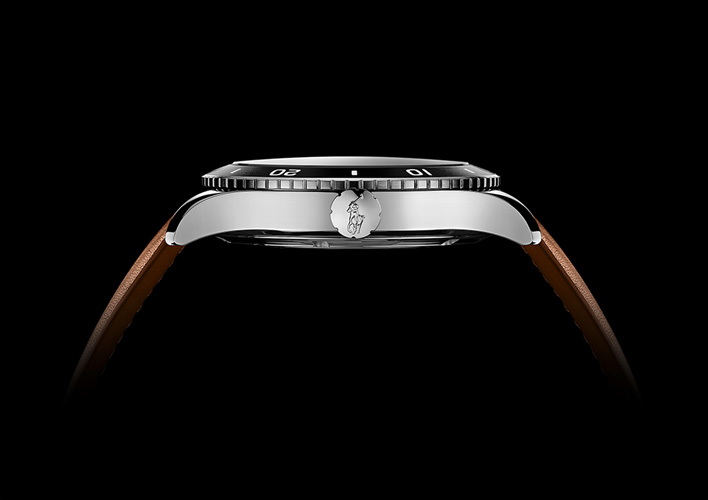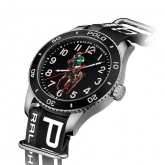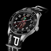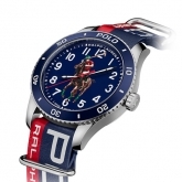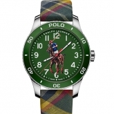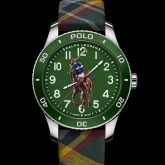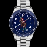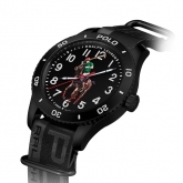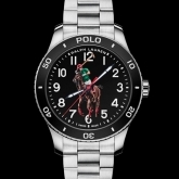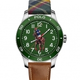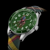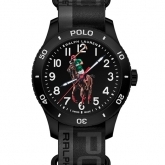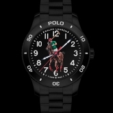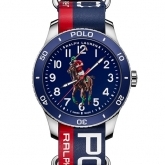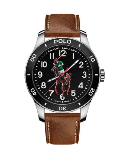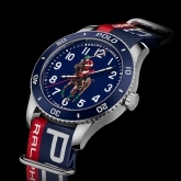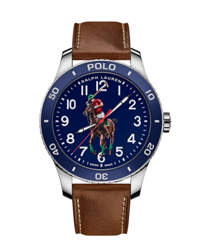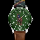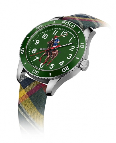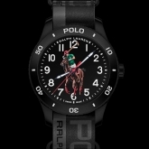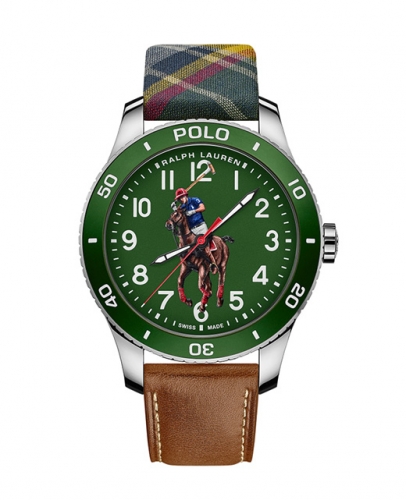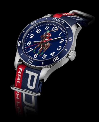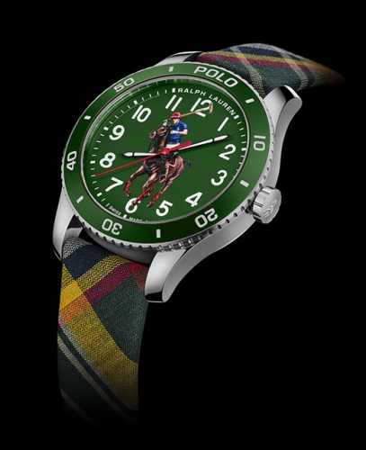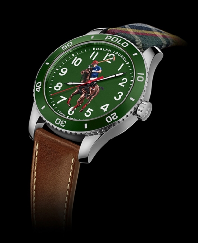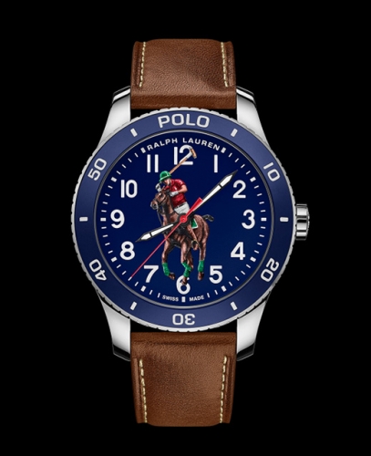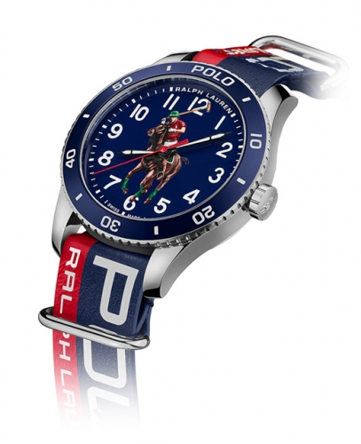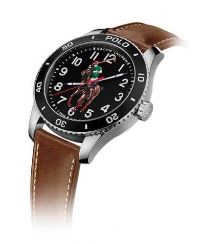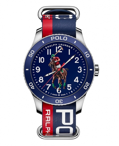 In 1972, Ralph Lauren's signature emblem—capturing the penultimate moment before mallet meets ball during a polo game—took its place on the chest of the Polo shirt, where it became a symbol recognized around the world. Now gracing the dial of this new watch collection, the logo is 3-D printed in multiple layers of color and complemented by printed Luminescent Arabic numbers on a lacquered dial and around the anodized aluminum ring on stainless steel bezel.