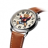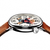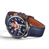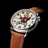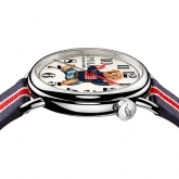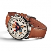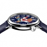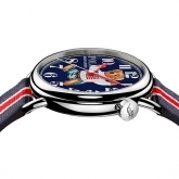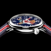Rendered in a vivid, nostalgic 3-D print, the dial is available in lacquered off-white or blue with contrast Arabic numbers. Red lacquered hands track hours and minutes, while a needle-like, black lacquered hand tracks seconds. Crafted in the elite tradition of Swiss horology, the 42 mm timepiece is powered by an RL200 caliber automatic Swiss movement that is hand-finished with vertical Côtes de Genève stripes and circular graining, known as perlage.