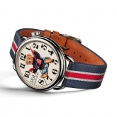 The off-white dial Sitting Flag Polo Bear Watch ships with a tan calf leather strap, while the blue dial ships with a navy calf leather strap. Interchangeable bracelet options include a sporty navy, red and white stripe silk strap, sold separately.