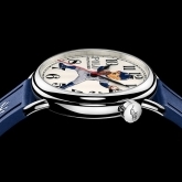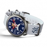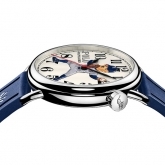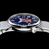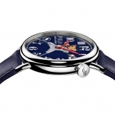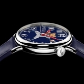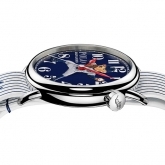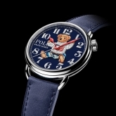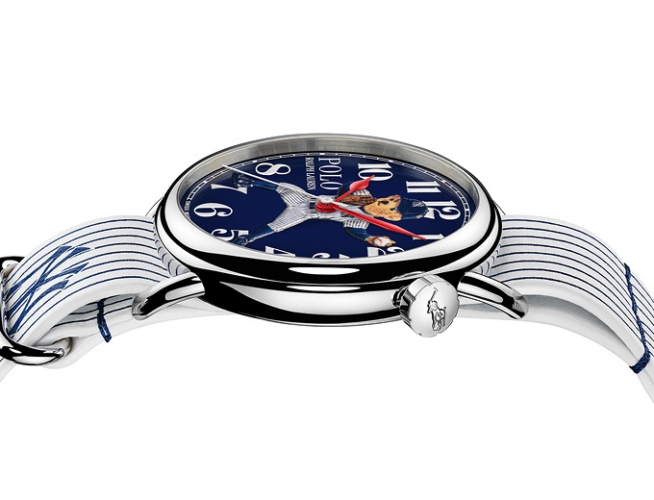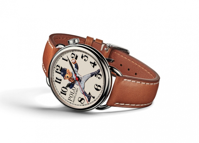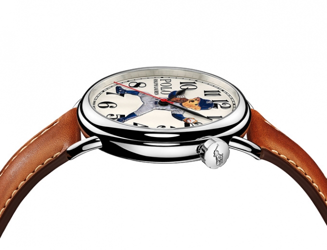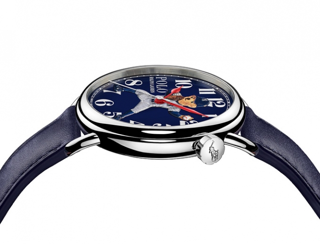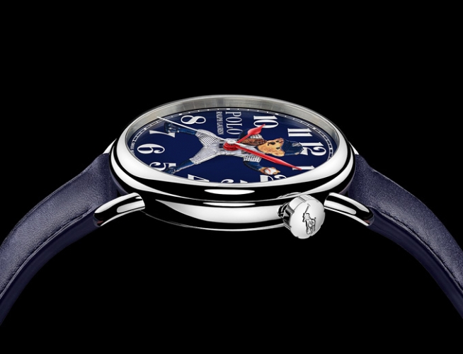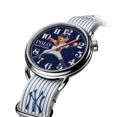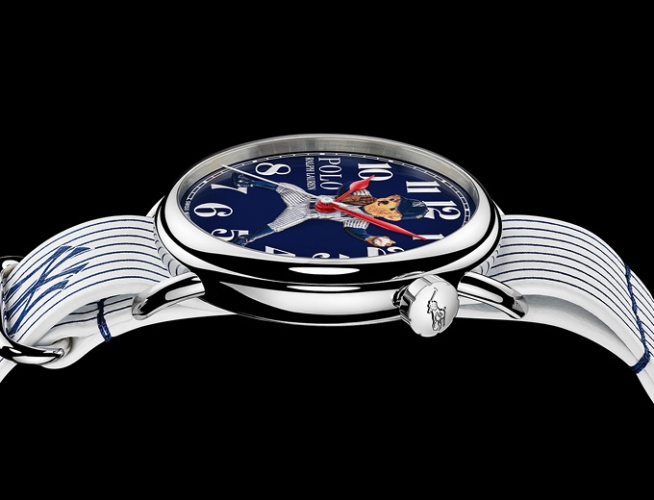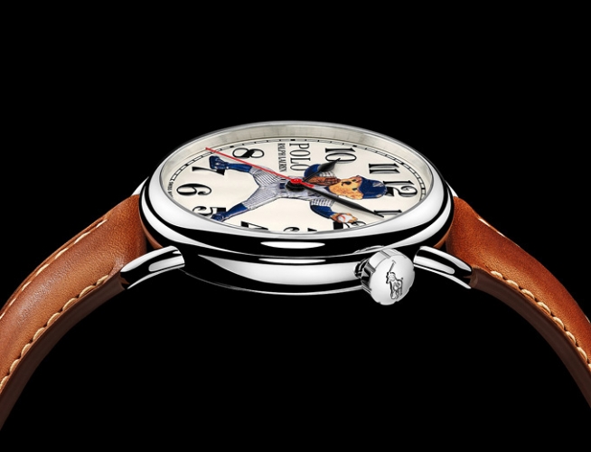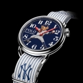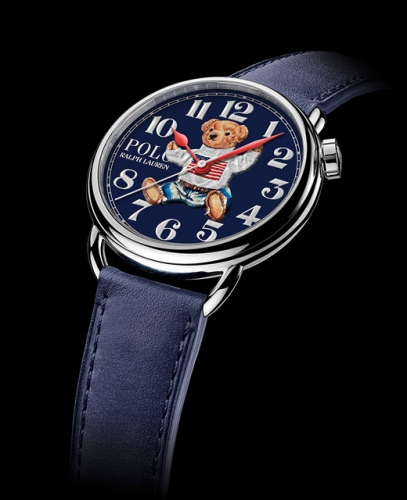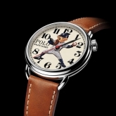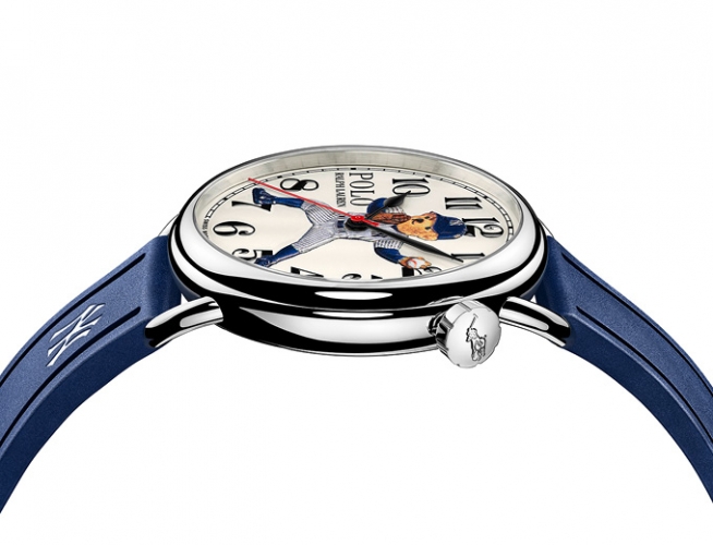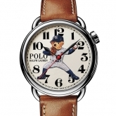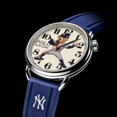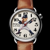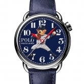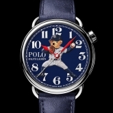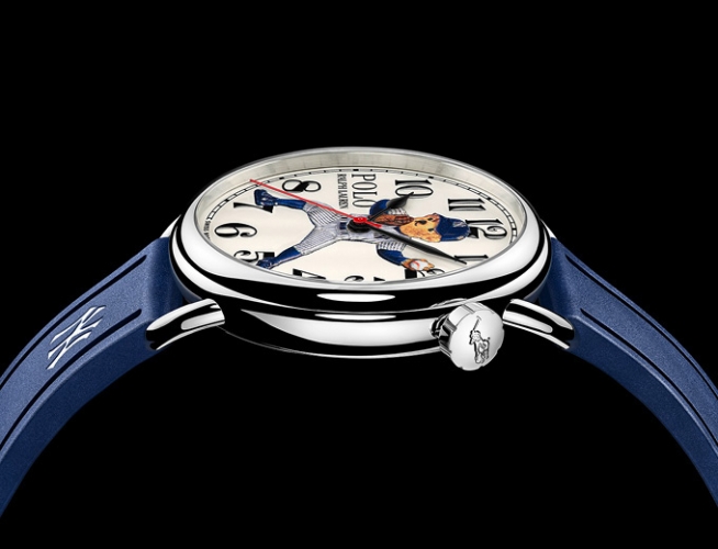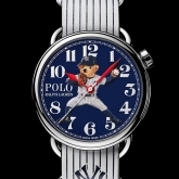 A life-long New Yorker and New York Yankees fan, Ralph Lauren threw out the ceremonial first pitch at Yankee Stadium in 2018, the year of the company’s 50th anniversary. The NY Yankees Polo Bear is depicted throwing the pitch — its left-handed stance, a direct reference to Ralph Lauren —wearing the classic Yankee pinstripe uniform. Rendered in a vibrant 3-D print, the dial is available in lacquered off-white or blue with contrast Arabic numbers. Black lacquered hands track the hours and minutes, while a needle-like, red lacquered hand tracks seconds. Crafted in the elite tradition of Swiss horology, the 42 mm timepiece is powered by an RL200 caliber automatic Swiss movement that is hand-finished with vertical Côtes de Genève stripes and circular graining, known as perlage.