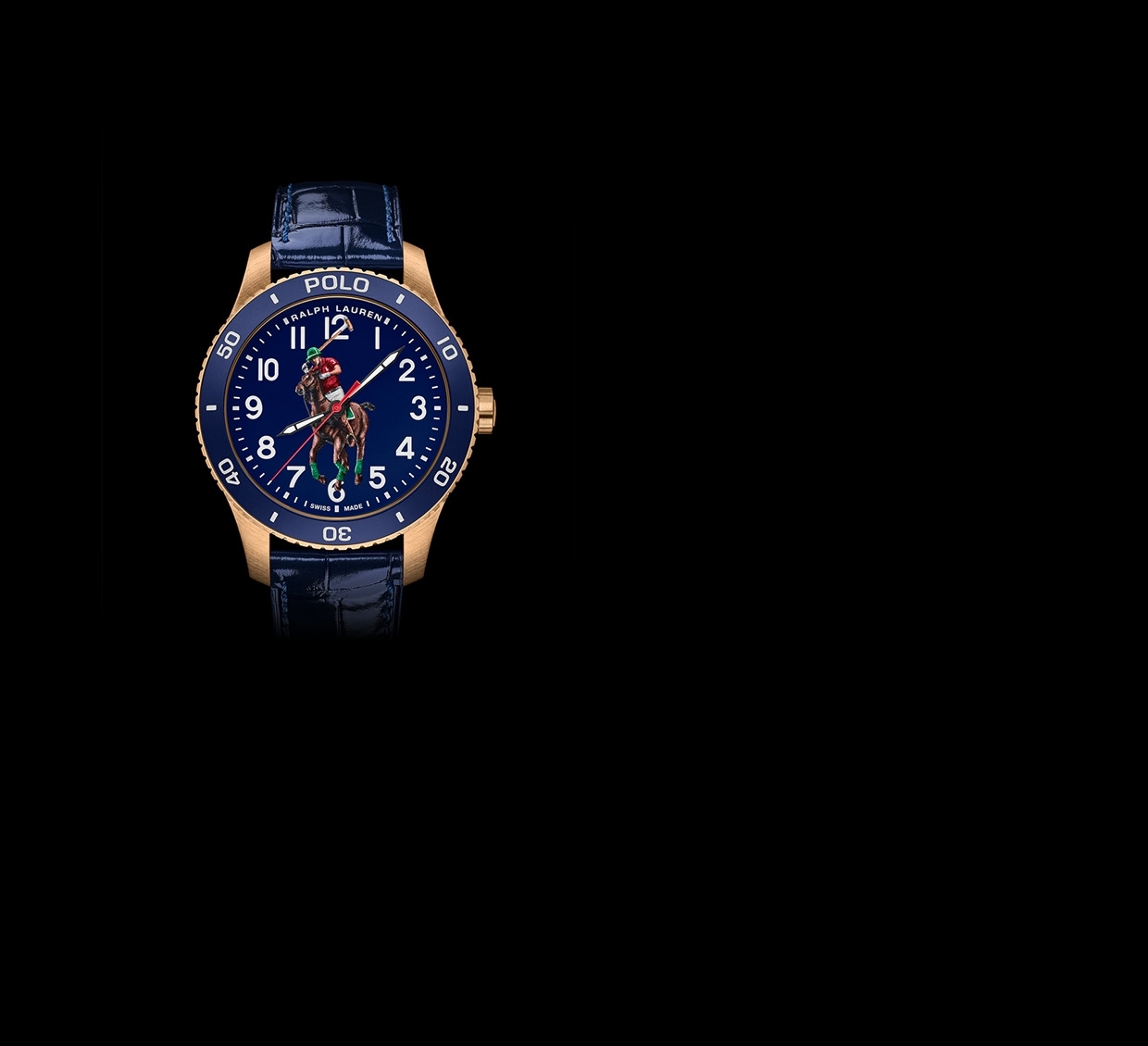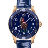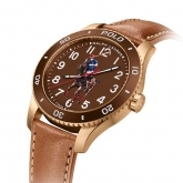 The new bronze Polo Watch ships with a classic tan calf leather strap with a bronze buckle. Interchangeable bracelet options include a glossy, navy alligator strap and an athletic-inspired navy rubber strap printed with the sporty Polo logo, both sold separately.