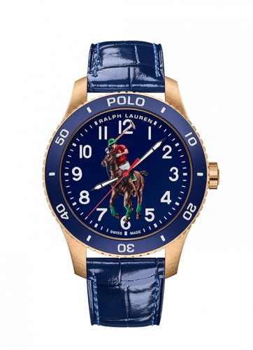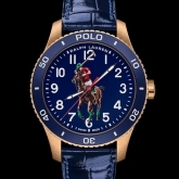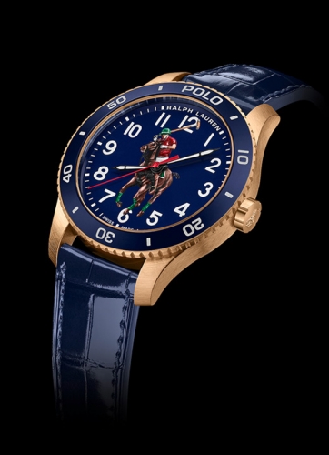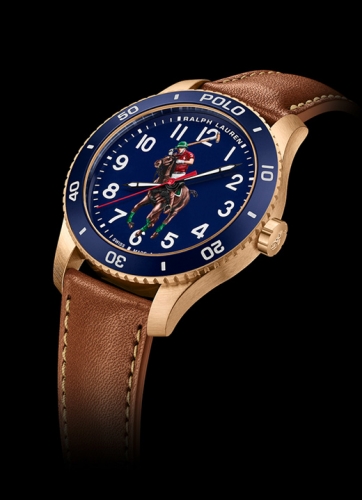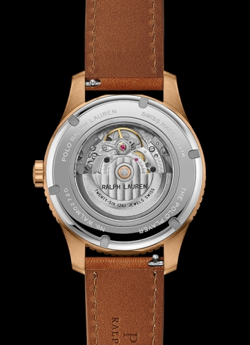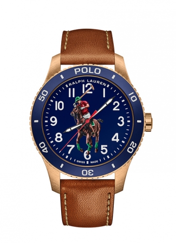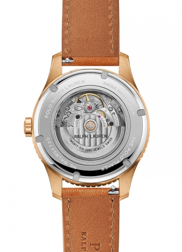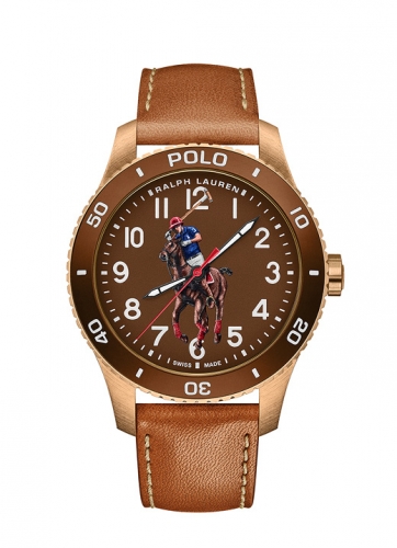 Defined by the artful embodiment of the international sophistication of a polo match, the dial features Ralph Lauren’s iconic logo, capturing the penultimate moment before the polo mallet hits the ball, rendered in a painterly 3-D print. Designed to reflect the timeless specifications of the world of Ralph Lauren, the watches in the Polo collection are crafted to the highest of Swiss horological standards. The 42 mm bronze timepiece is powered by an RL200 caliber automatic Swiss movement that is hand-finished with vertical Côtes de Genève stripes and circular graining, known as perlage.